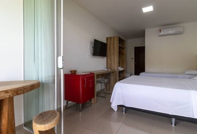 Suíte moderna maior (24m²), composta por uma cama queen size e uma cama de solteiro, ar-condicionado split, frigobar, smarTv e mesa de escritório, chuveiro elétrico, amenities para banho, além de secador de cabelo e ferro de passar à disposição. Possui bela vista ao Rio São Francisco através da varanda privativa do quarto!