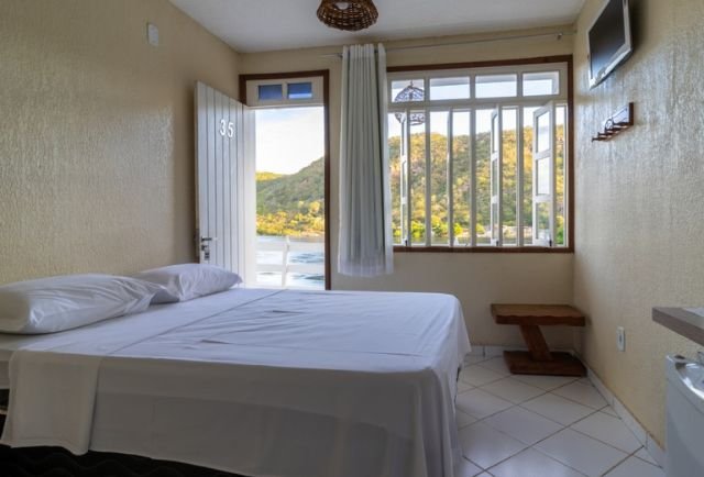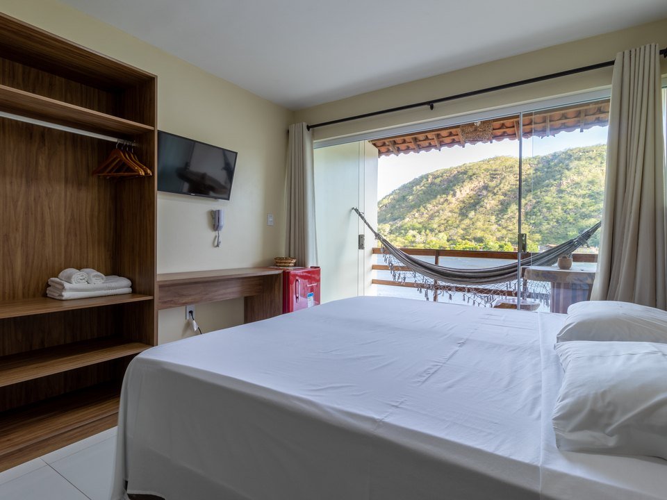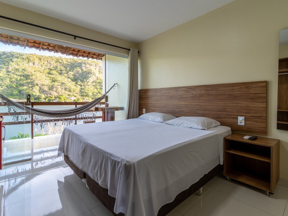 Suíte moderna (20m²), composta por cama queen size, ar-condicionado split, frigobar, smart tv e bancada, chuveiro elétrico, amenities para banho, além de secador de cabelo e ferro de passar à disposição. Possui uma bela vista pro Rio São Francisco através da varanda privativa do quarto!
