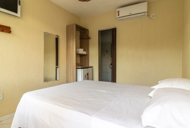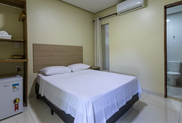 Suíte moderna (15m²), composta por cama de casal, ar-condicionado split, frigobar, televisão e bancada, chuveiro elétrico, amenities para banho, além de secador de cabelo e ferro de passar à disposição. Sem vista pro Rio.