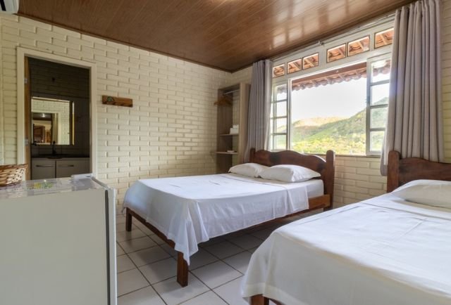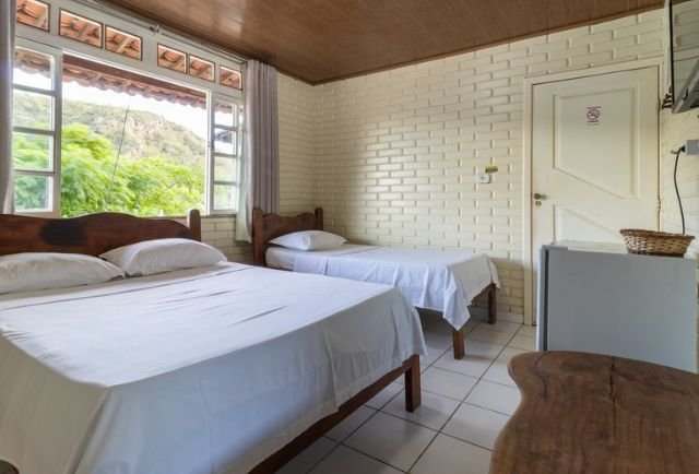 Suíte rústica (17m2), composta por uma cama de casal e uma cama de solteiro, ar-condicionado split, frigobar, televisão, chuveiro elétrico, amenities para banho, além de secador de cabelo e ferro de passar à disposição.